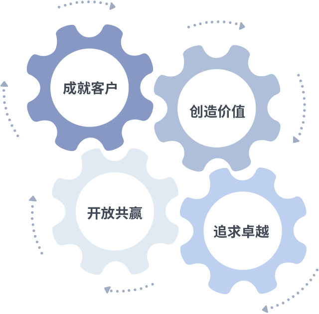 成就客户是一切决策的出发点,创造价值是衡量所有工作的标准,追求卓越是东升国际做事做人的态度,开放共赢是东升国际的格局也是最终的结果。价值观的齿轮环环相扣,推动着组织里的每个人不断向前。